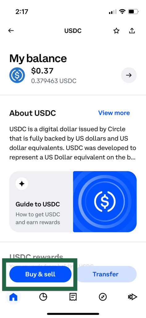 In your Coinbase app, search for USDC in the search bar at the top. Tap USDC, then tap Buy & sell.