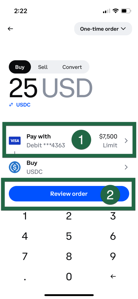 Put how much USDC you want to buy, make sure your payment method is set to your debit card, then tap Review Order. On the next screen, tap Buy Now.